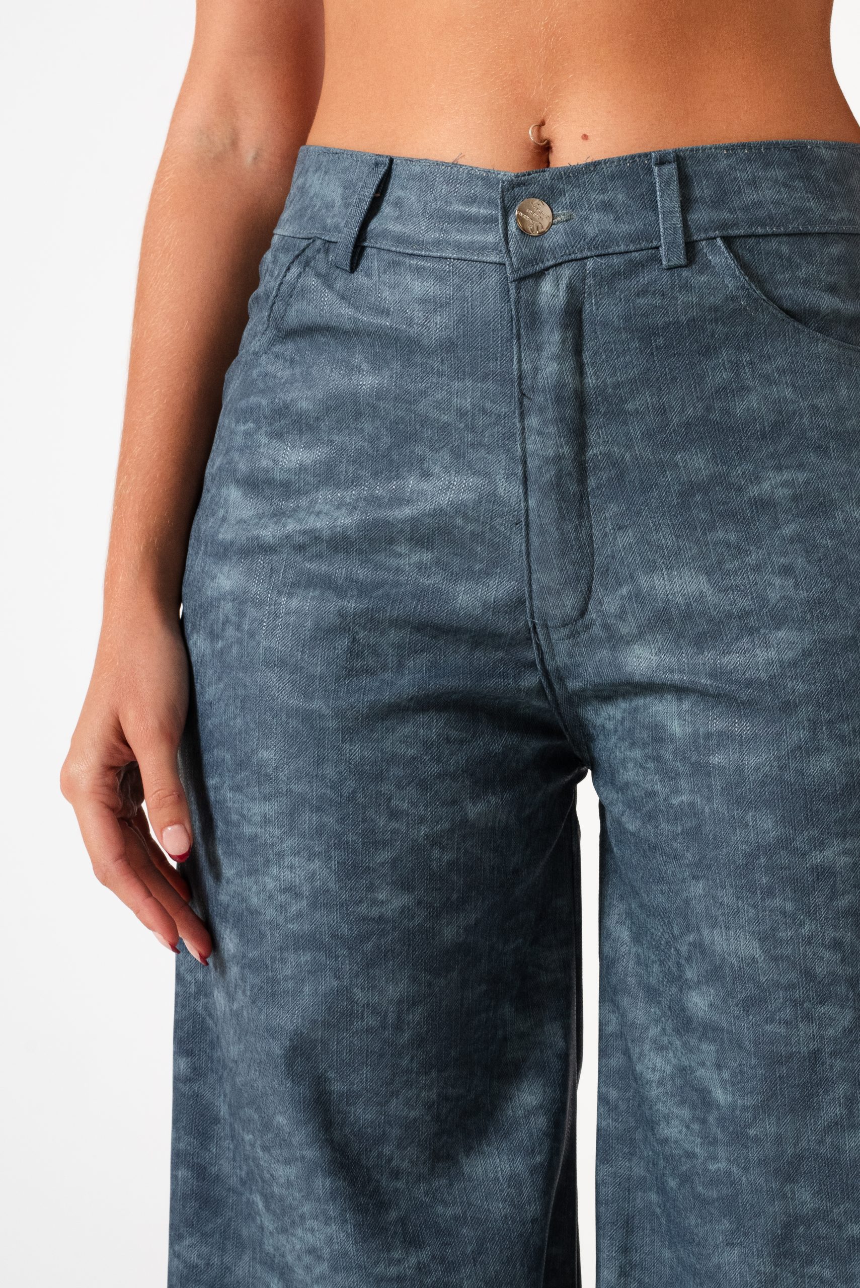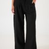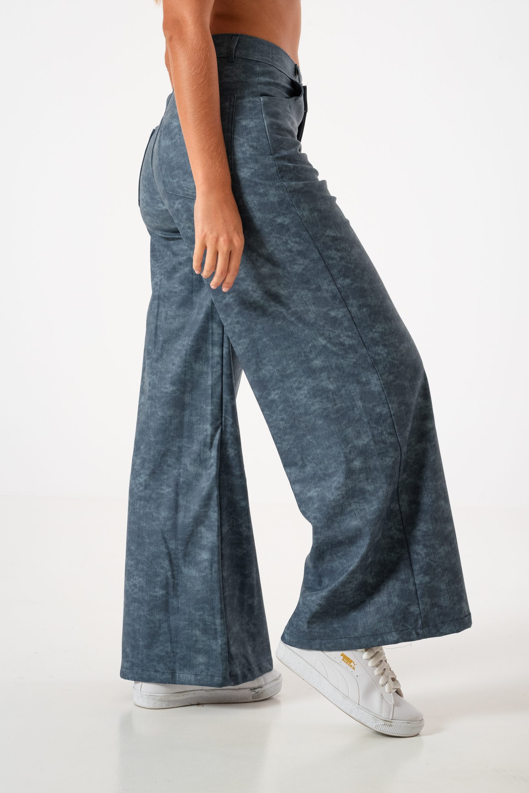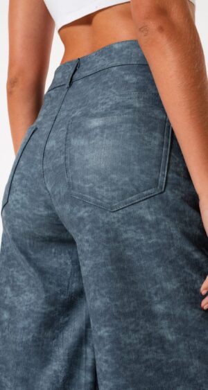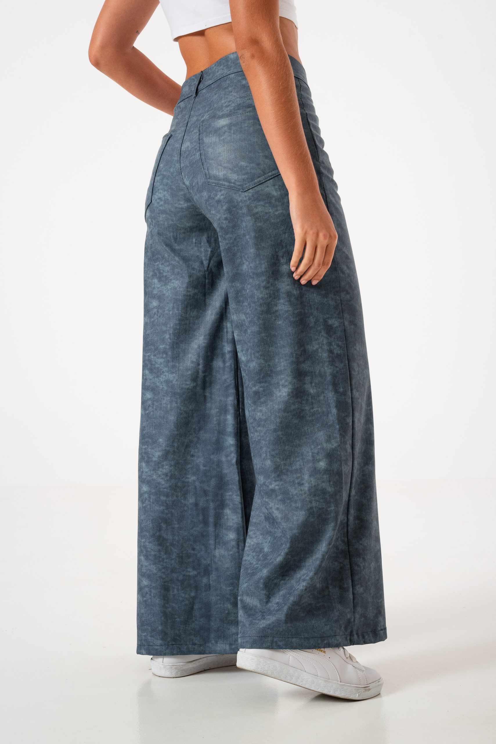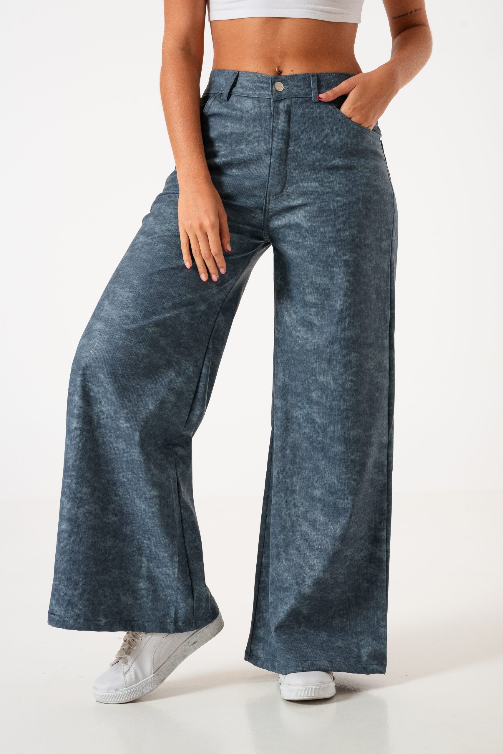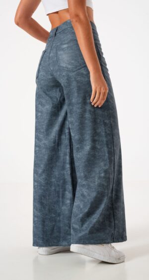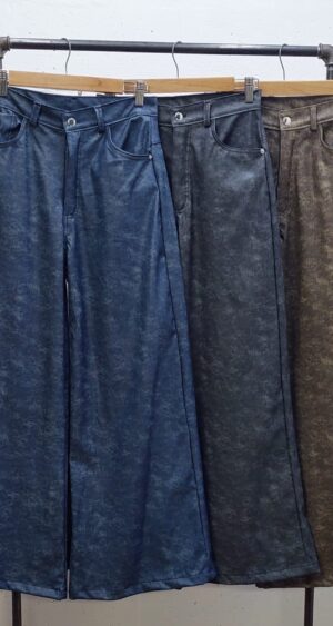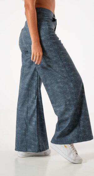 Pantalon estilo wid leg confeccionado en tela de bengalina engomada con detalle de bolsillos, pasacinto, cierre y boton.