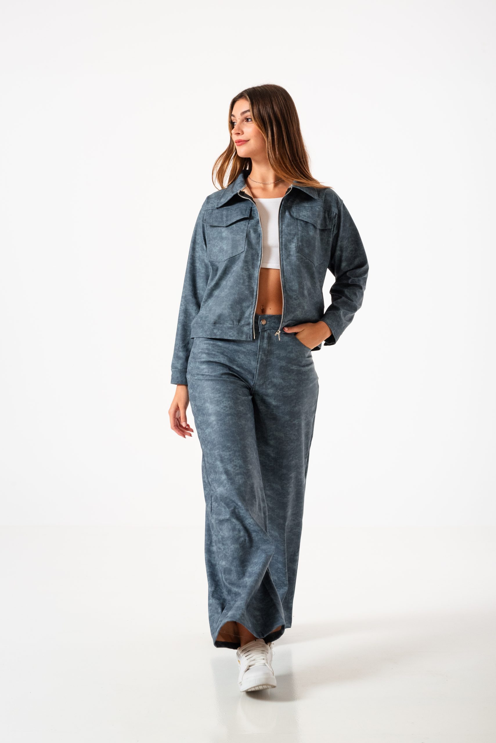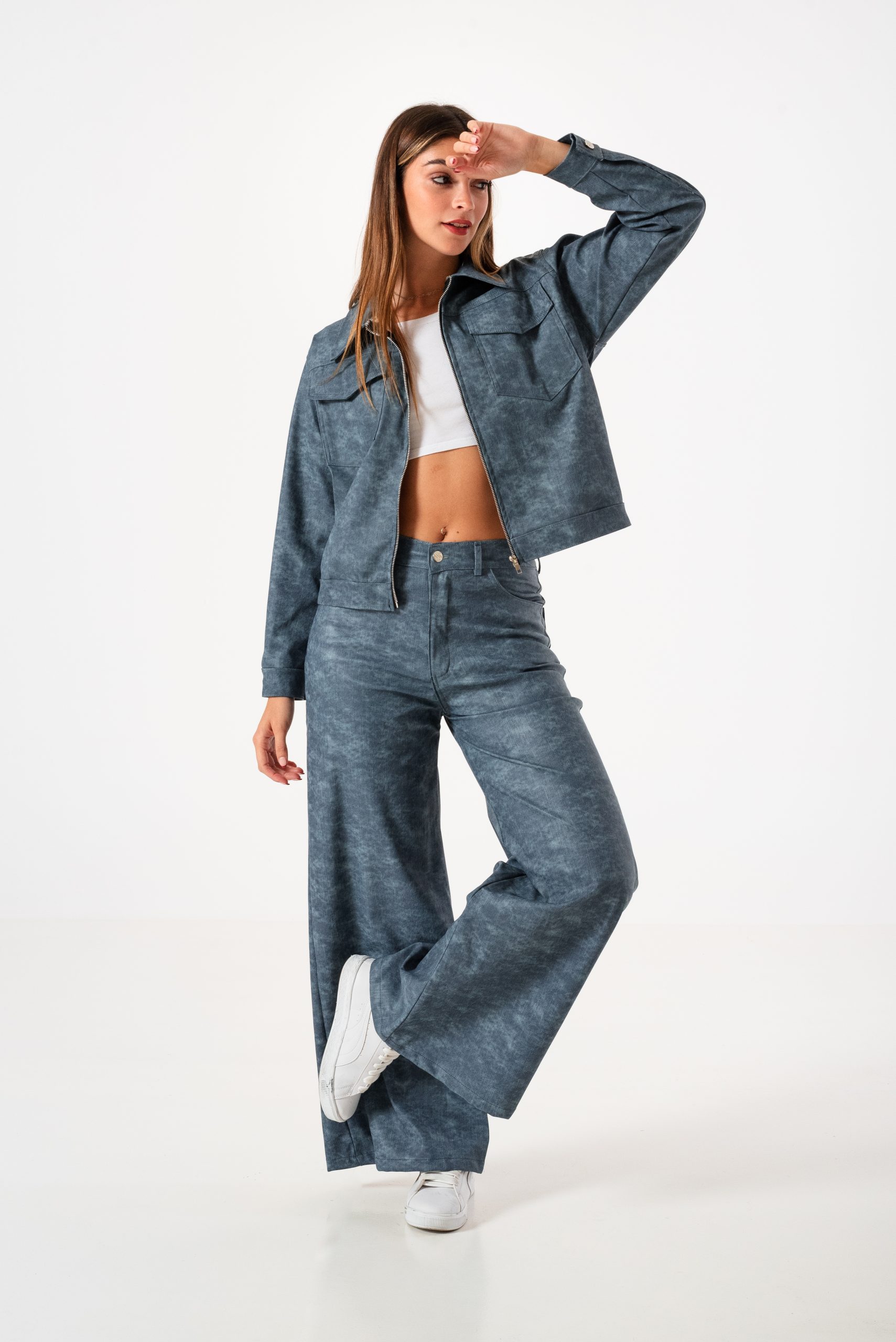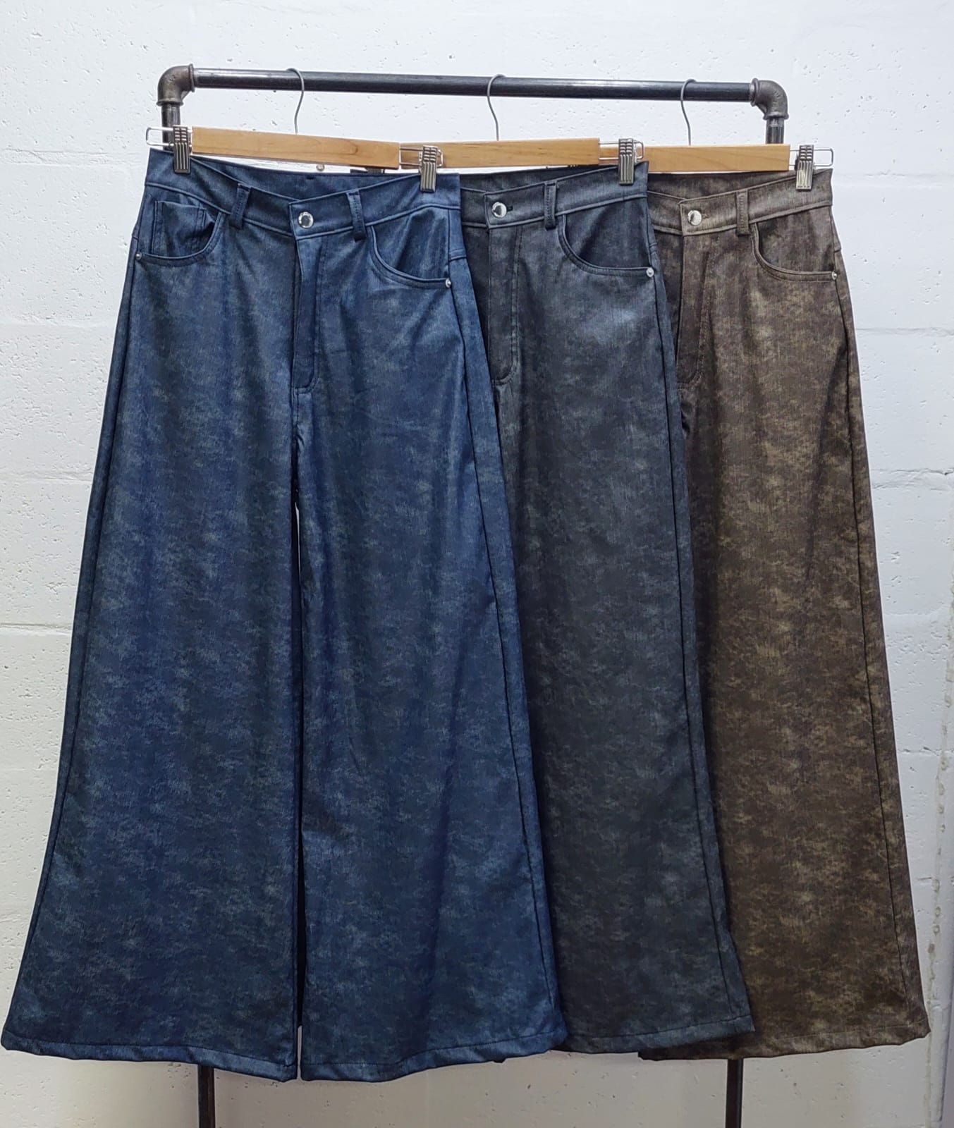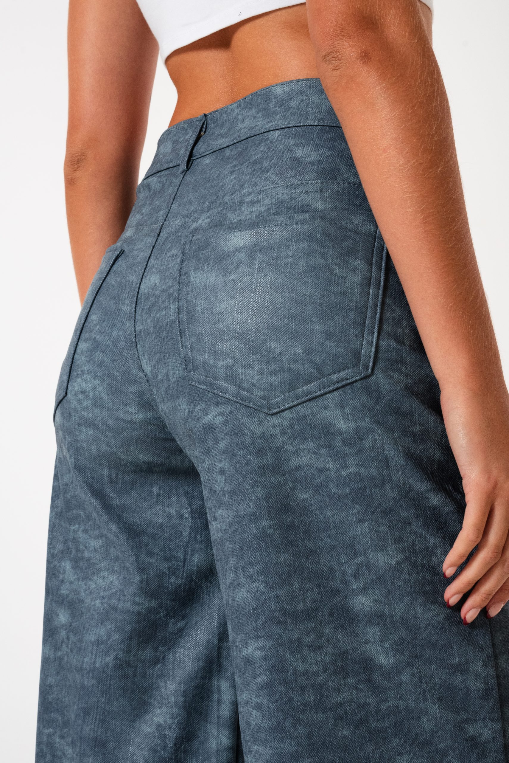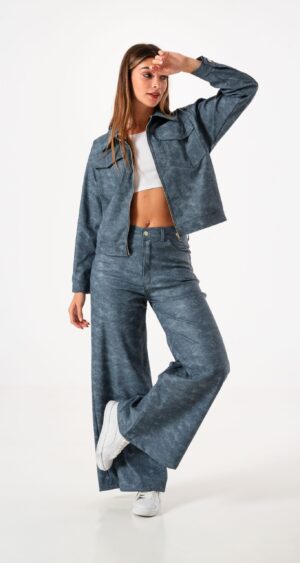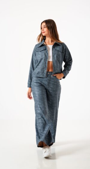 Pantalon estilo wid leg confeccionado en tela de bengalina engomada con detalle de bolsillos, pasacinto, cierre y boton.