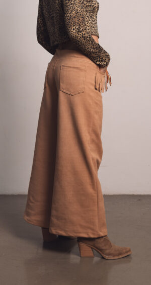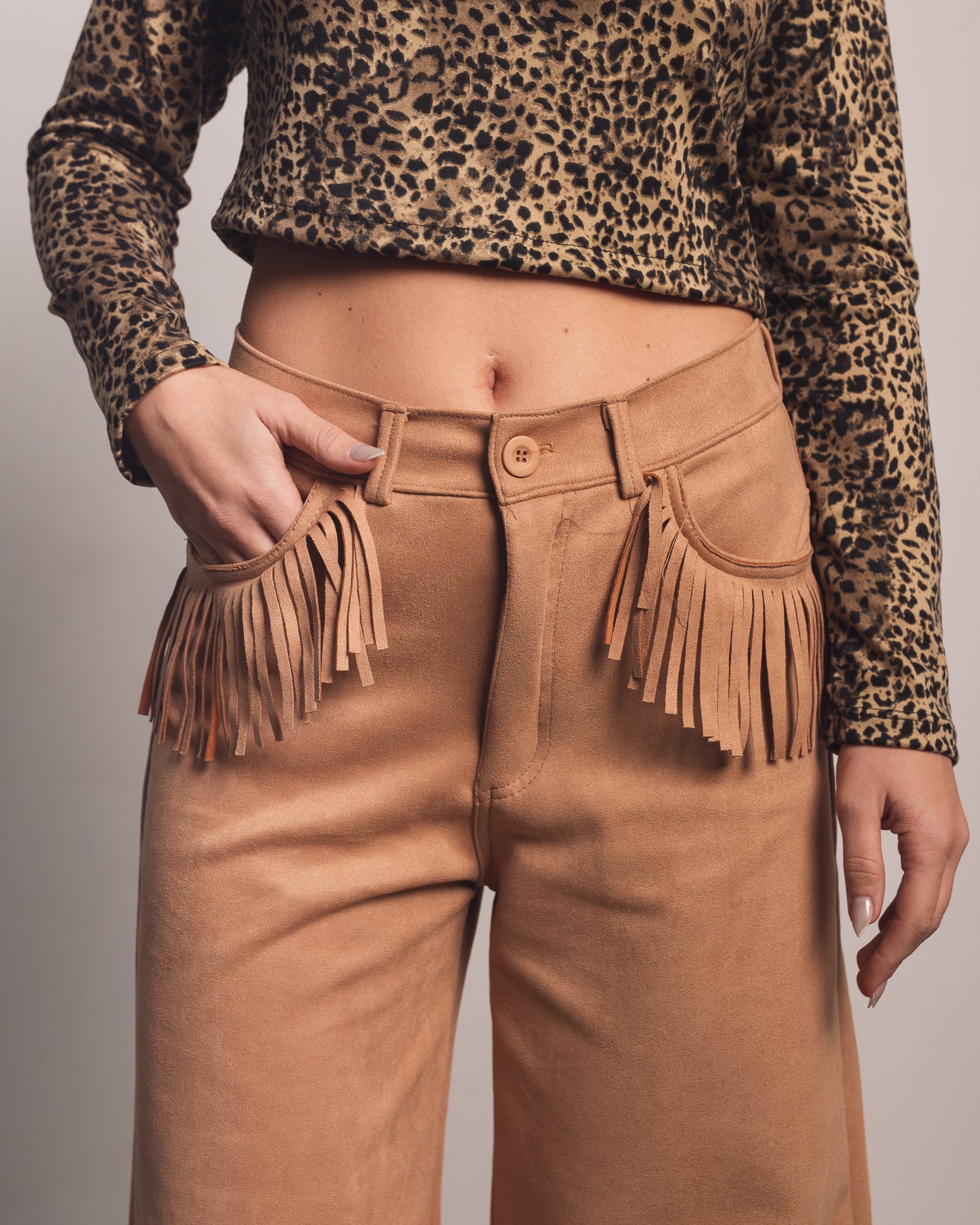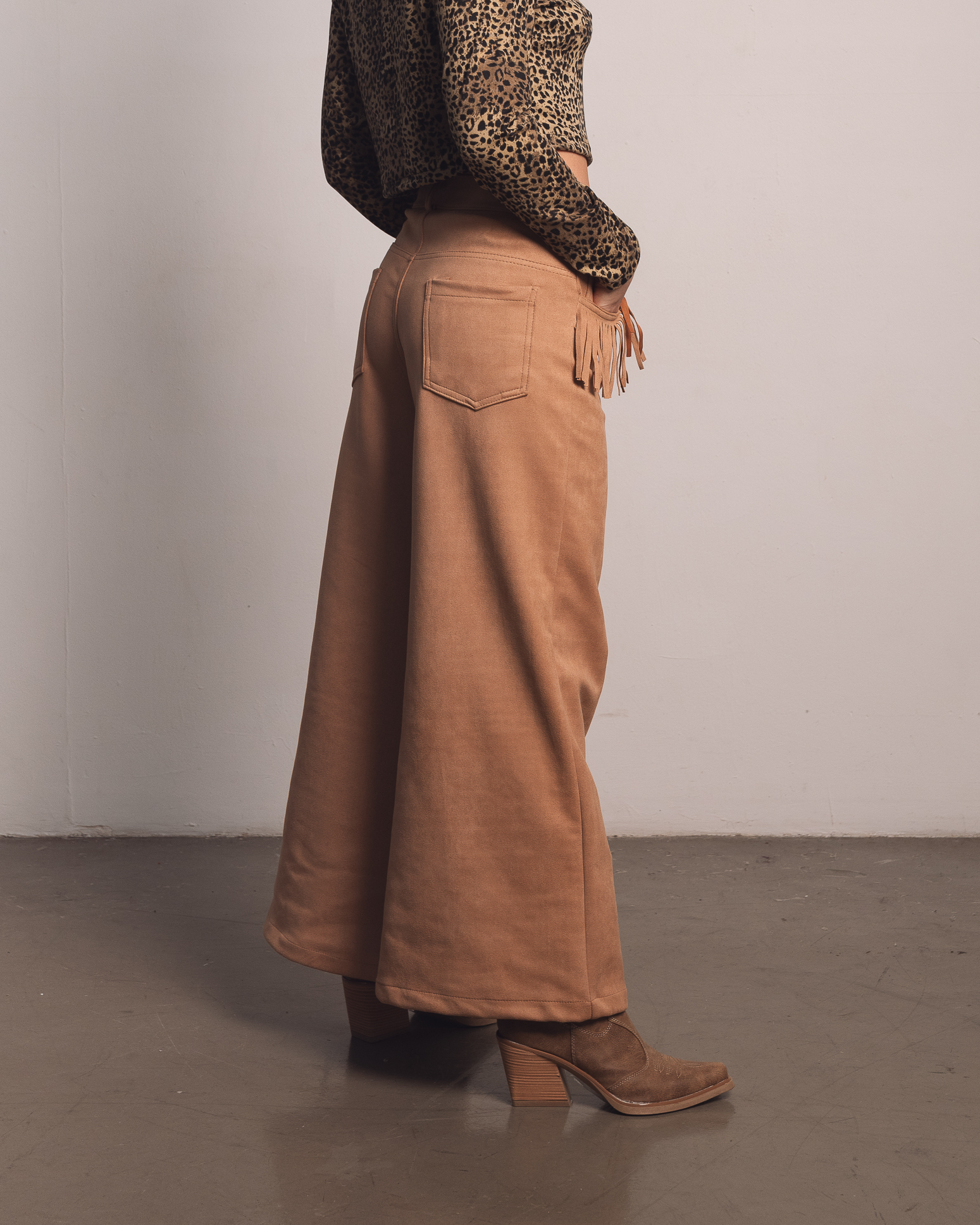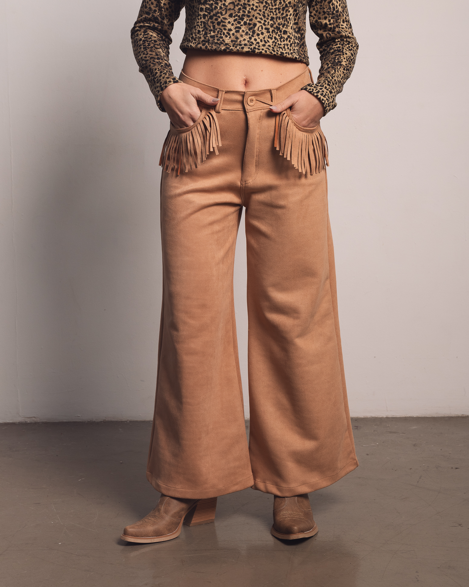 Pantalon estilo wid leg confeccionado en tela de sued con detalle de flecos, bolsillos, pasacinto, cierre y boton