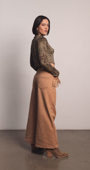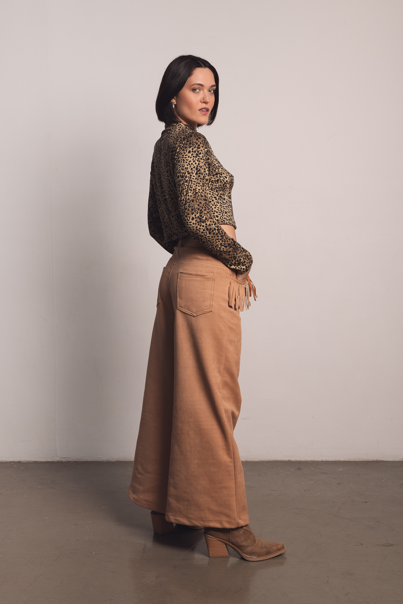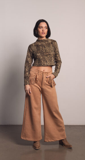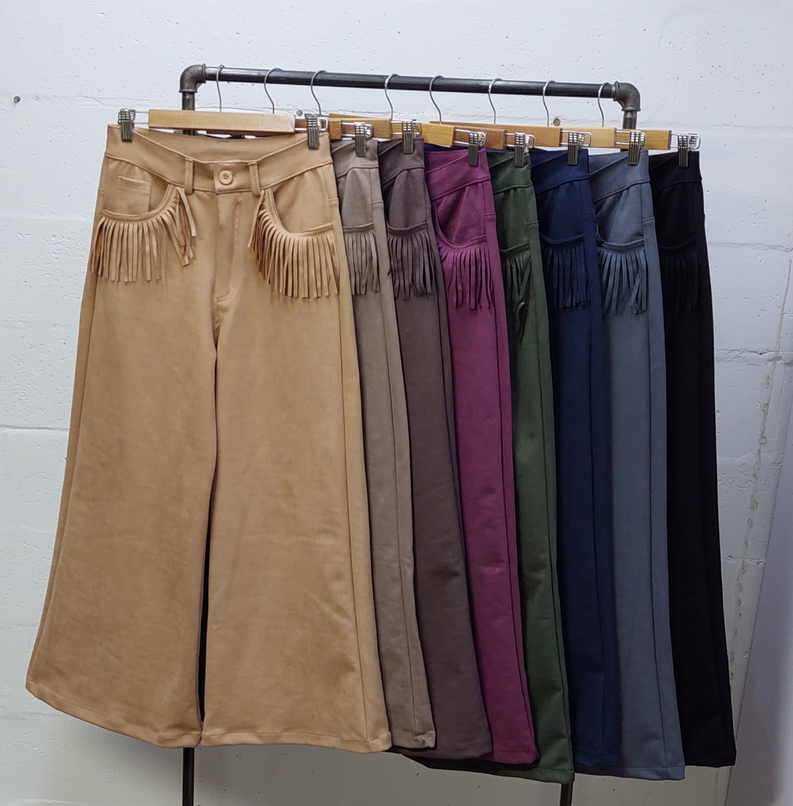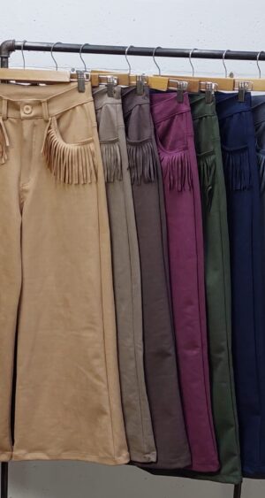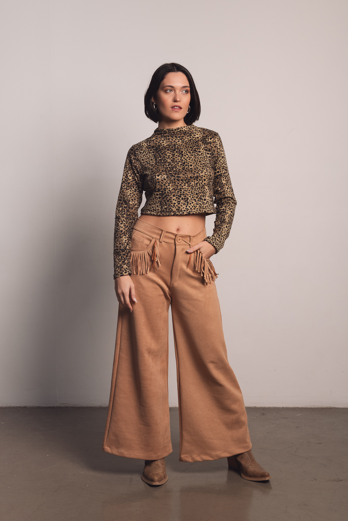 Pantalon estilo wid leg confeccionado en tela de sued con detalle de flecos, bolsillos, pasacinto, cierre y boton
