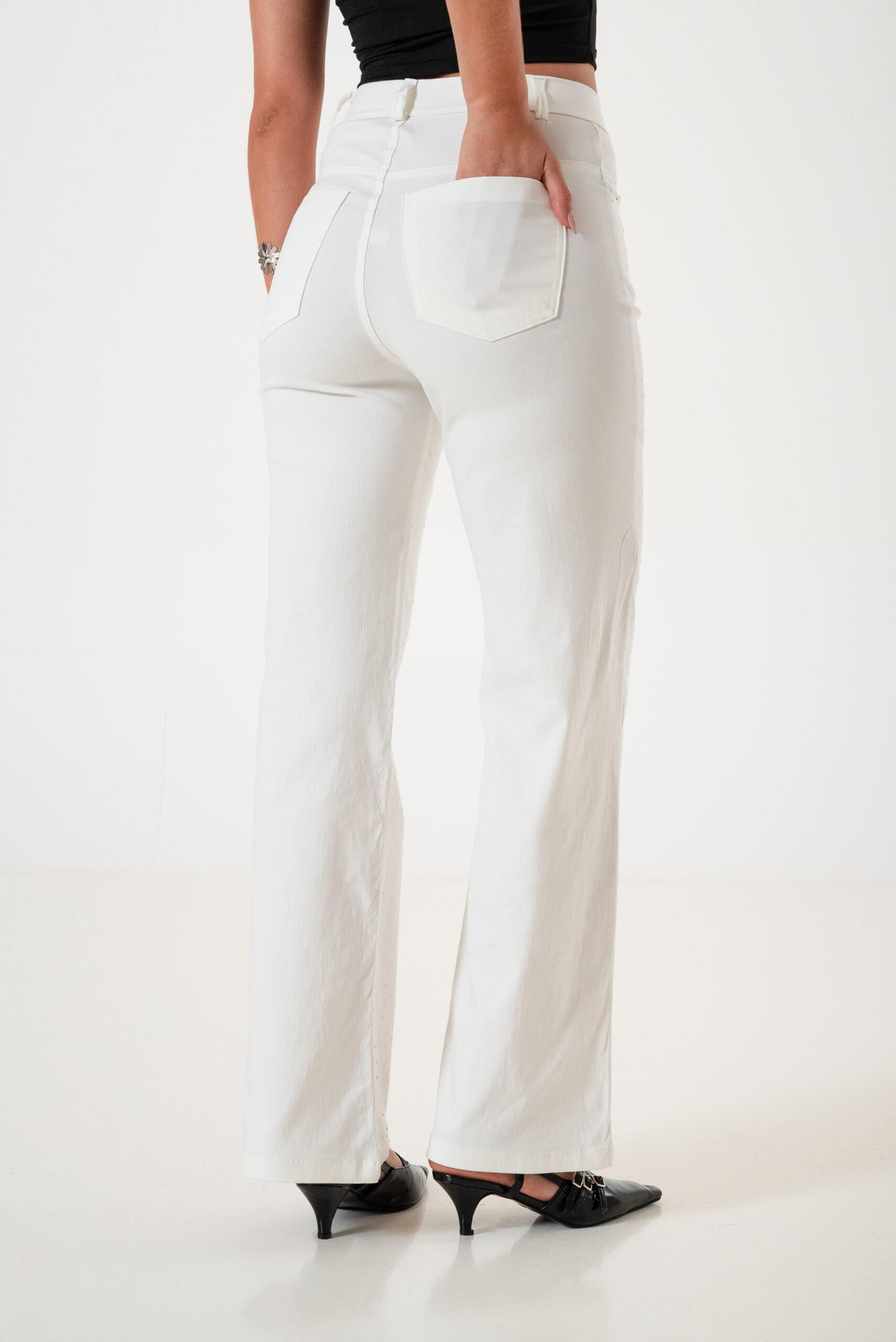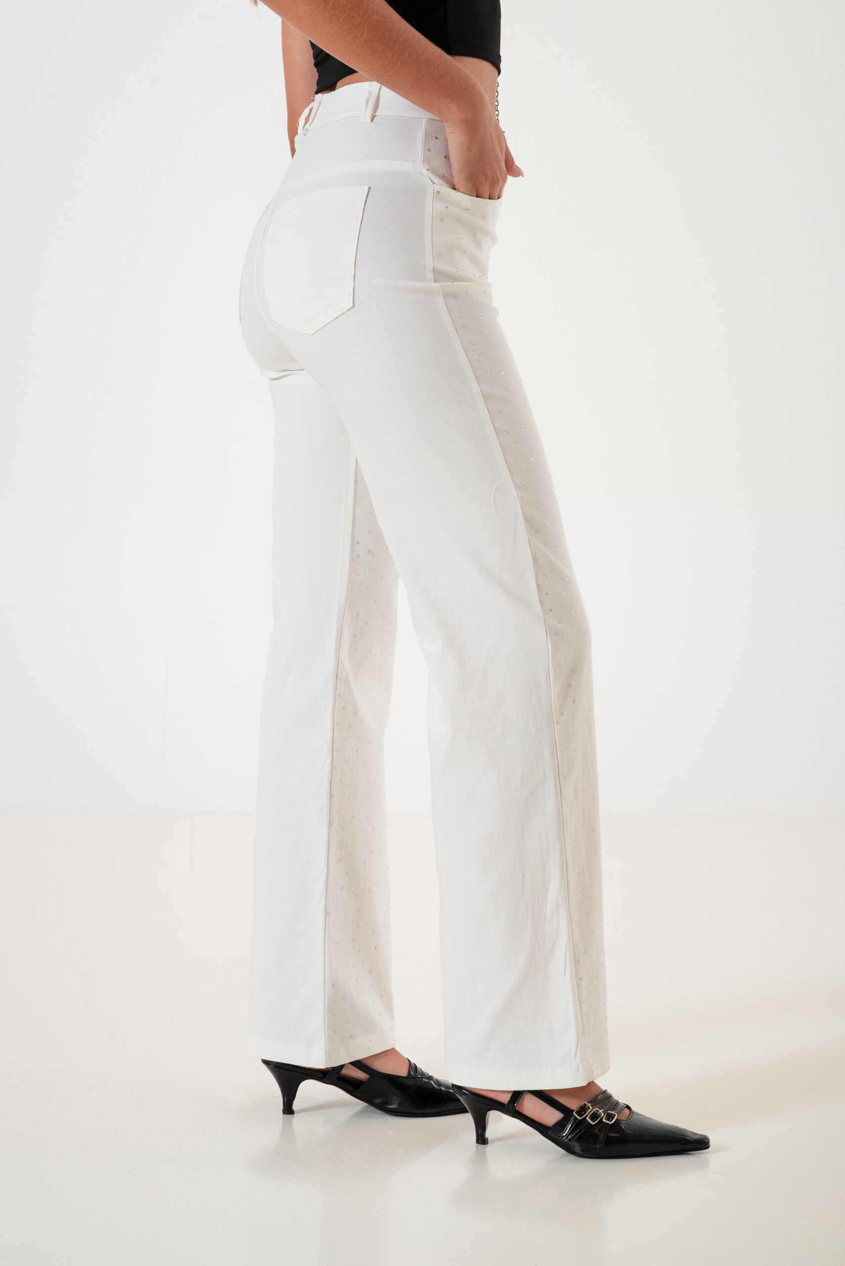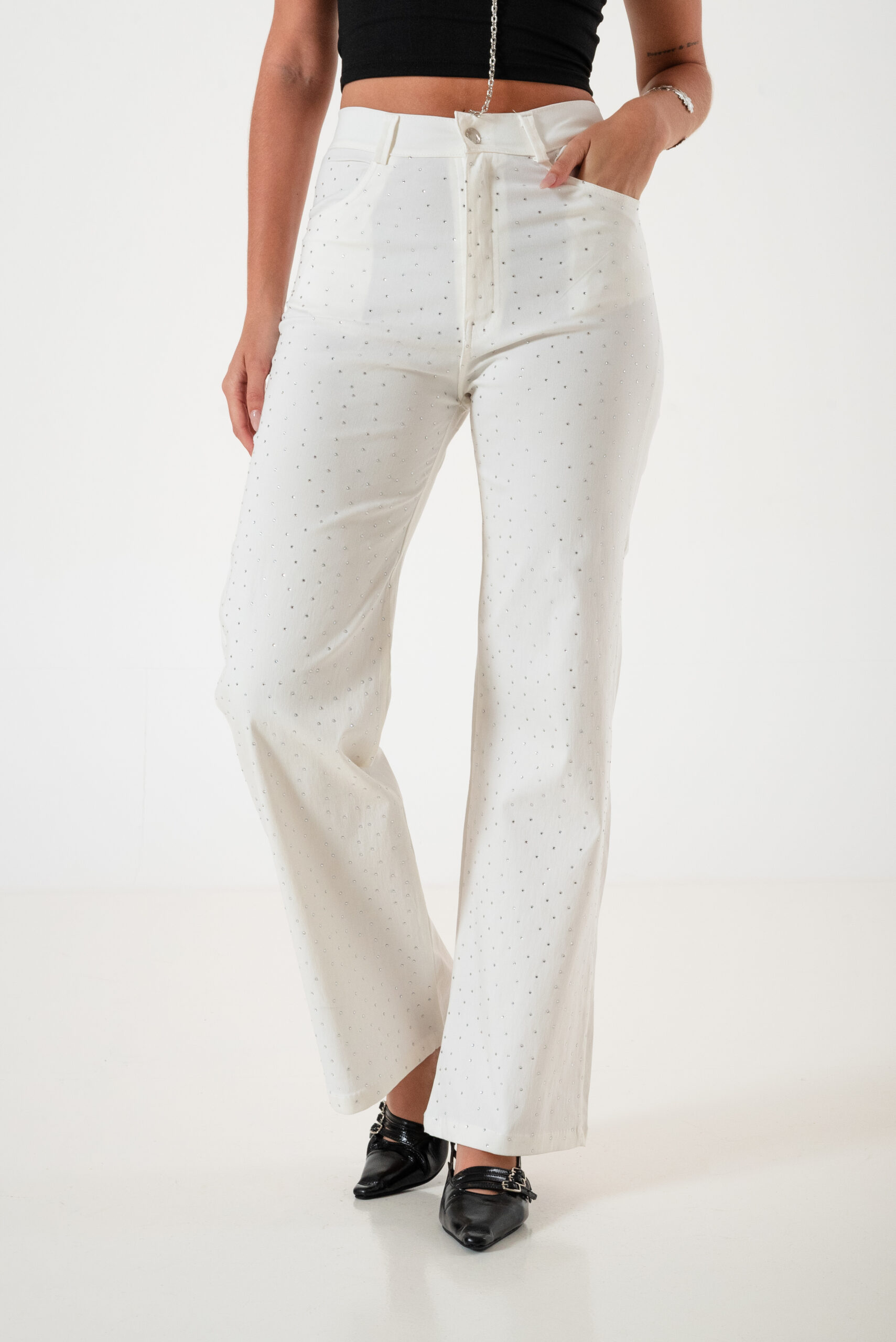 Pantalon estilo wid leg confeccionado en tela de bengalina con detalle de strass delantero, bolsillos, pasacinto, cierre y boton